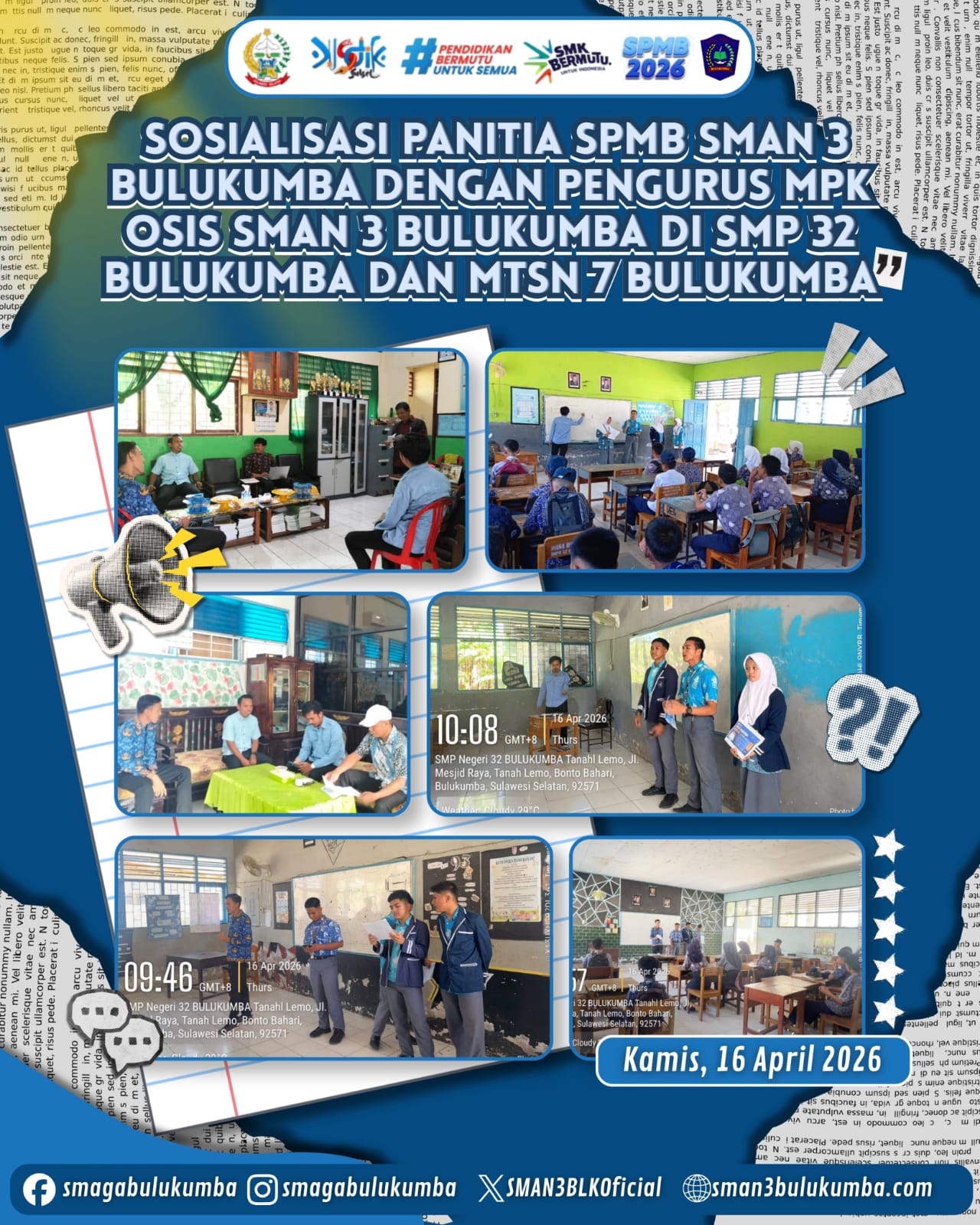 Dalam rangka mempersiapkan pelaksanaan Seleksi Penerimaan Murid Baru (SPMB) tahun ajaran 2026/2027, panitia SPMB SMAN 3 Bulukumba terus melakukan berbagai upaya strategis guna memberikan informasi yang jelas dan menyeluruh kepada calon peserta didik. Salah satu langkah yang dilakukan adalah melalui kegiatan sosialisasi langsung ke sekolah-sekolah tingkat SMP/MTs yang berada di wilayah Kabupaten Bulukumba.